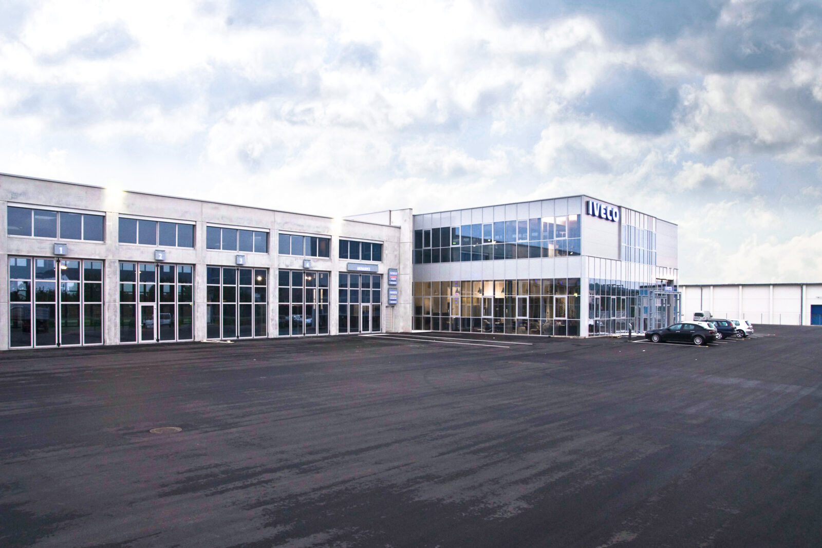 Der Neubau von Iveco beinhaltet eine Lkw- und Buswerkstätte, Verkaufsräume, Lkw- und Bus-Prüfstraße, Schulungswerkstätte und Büros. Das Objekt ist durch zeitgenössische Architektur und Gebäudetechnik definiert. Die eingesetzte Bautechnologie wie optimale Dämmung, Bauteilaktivierung, Flächenheizung, Nahwärmeversorgung durch Biomasse sorgt für eine energieeffiziente Gebäude.