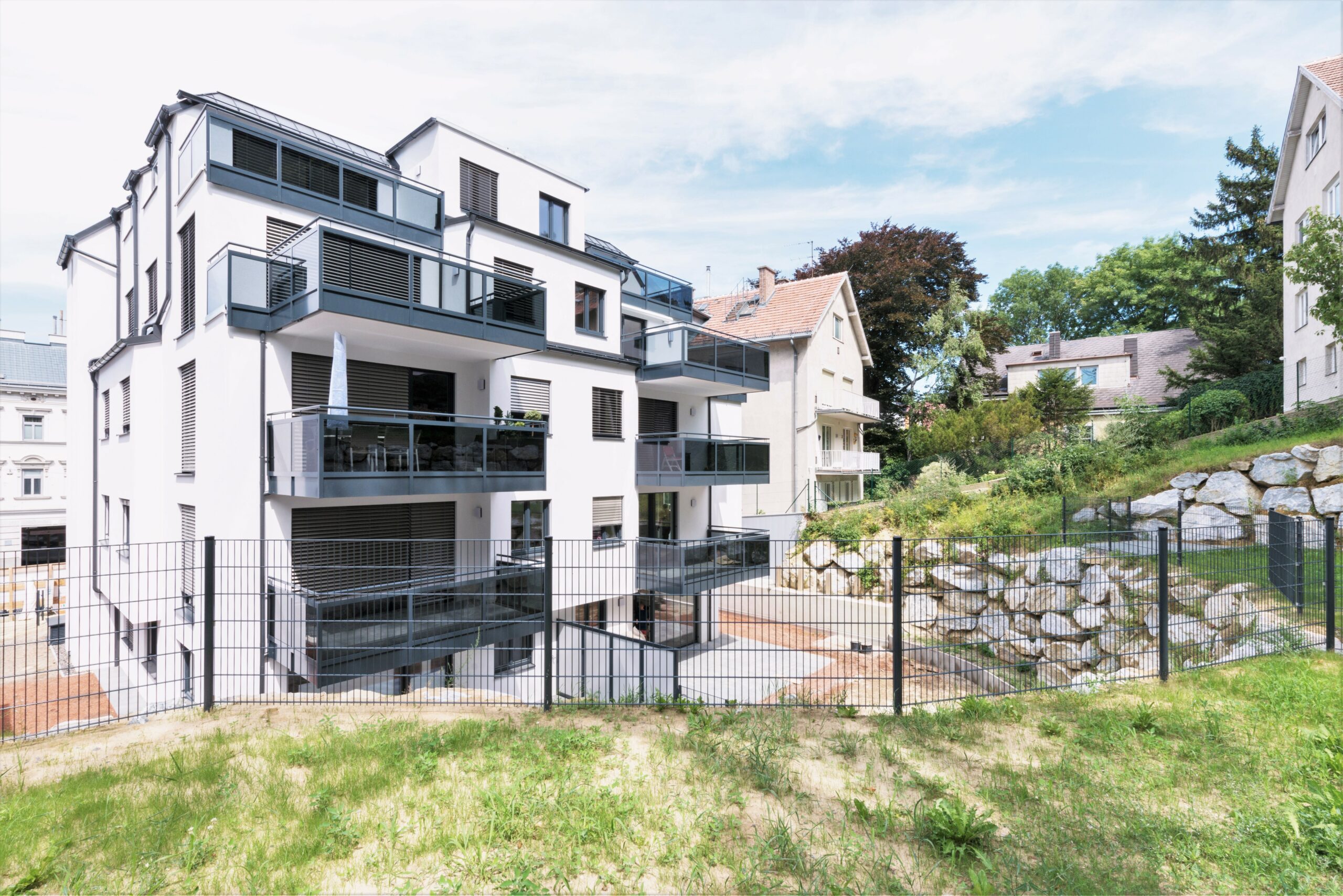 Neubau eines Mehrfamilienwohnhauses im 19. Wiener Bezirk. Gemischte Grundrisstypen mit Wohnflächen zwischen 40 m² und 120 m², entworfen für verschiedene Generationen. Die Wohnungen sind mit hochwertigen Materialien